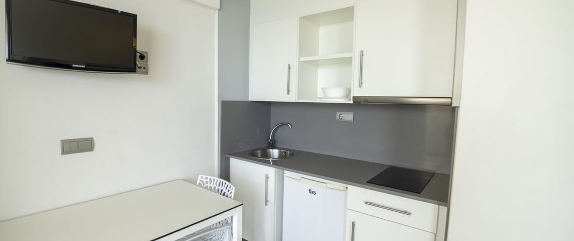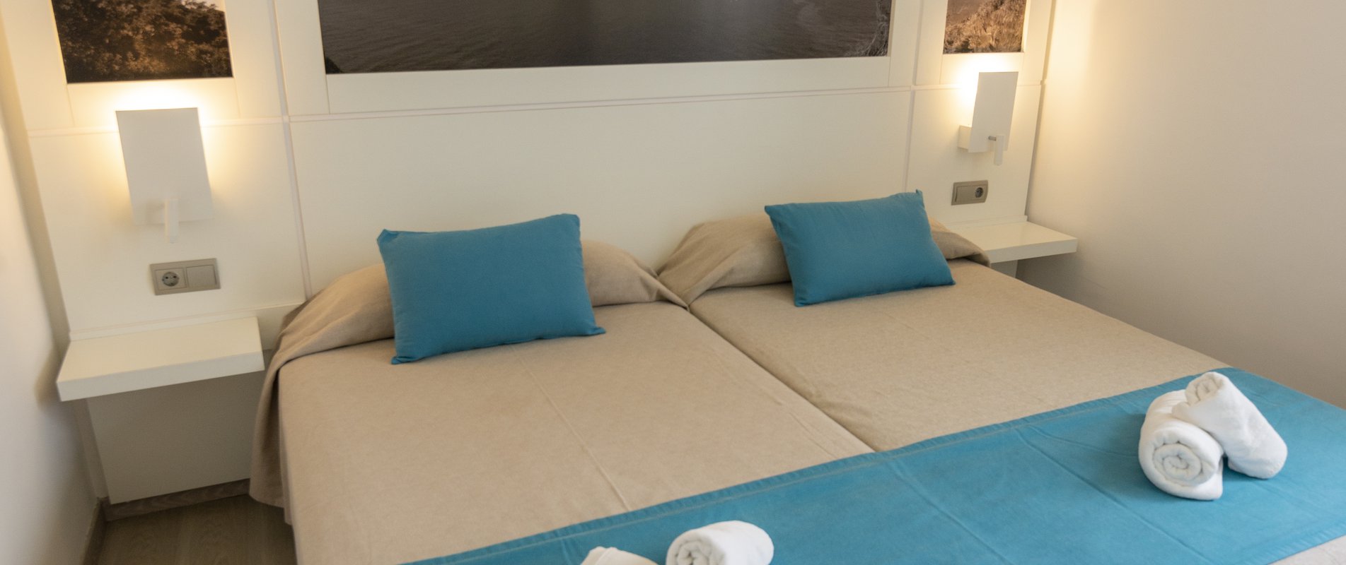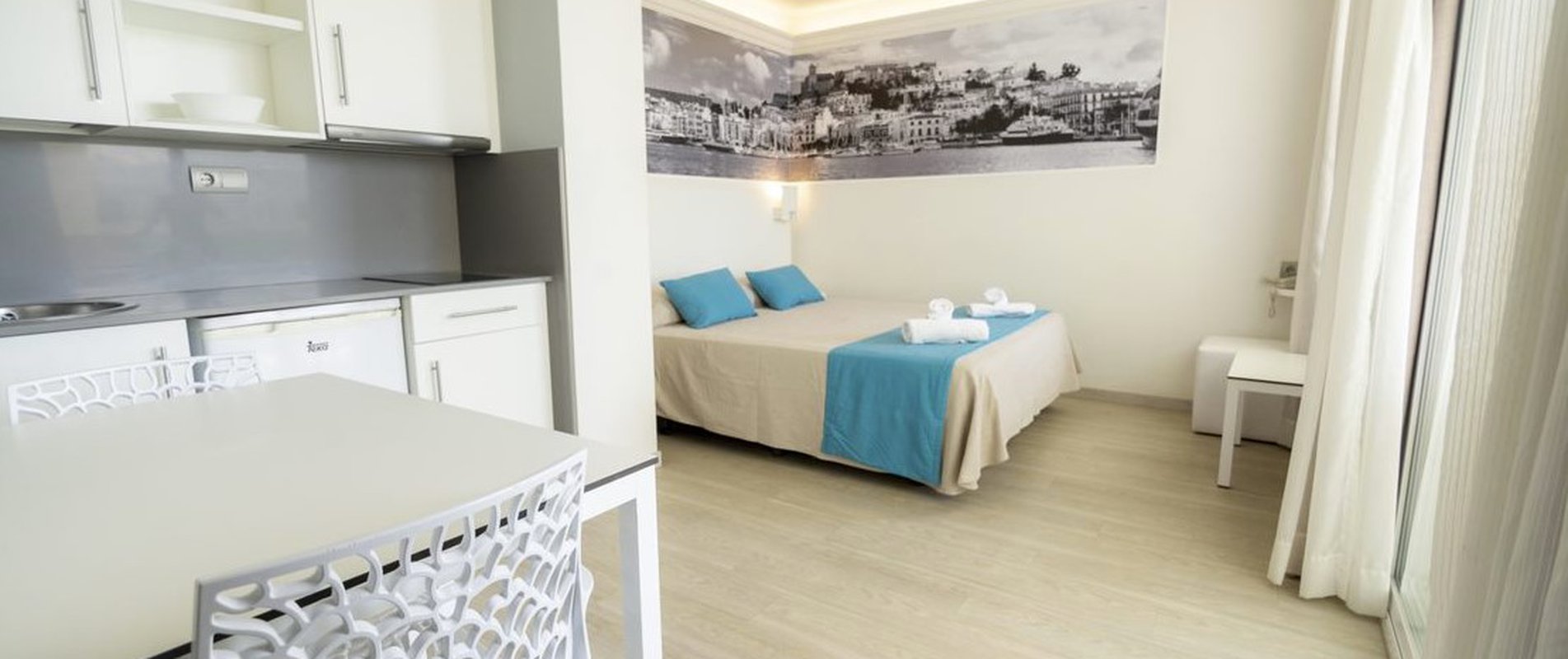 Ponemos a tu disposición nuestros estudios con capacidad para 1 o 2 personas, que incluyen en su interior una cama de matrimonio, un baño privado con ducha, una pequeña terraza y una cocina tipo kitchenette en el mismo ambiente. También te ofrecemos apartamentos de categoría estándar o categoría superior, de 40 metros cuadrados, con capacidad para 2 o 3 personas. Disponen de un dormitorio con dos camas individuales, baño privado con ducha, cocina completamente equipada, salón comedor con un sofá cama y un balcón con vistas al mar o a la piscina. Equipados con todo lo que puedas necesitar durante tu estancia, todos nuestros estudios y apartamentos en Playa d’en Bossa cuentan con aire acondicionado, televisor de pantalla plana con canales vía satélite, caja fuerte, teléfono y, además, posibilidad de aparcamiento gratuito en los alrededores.